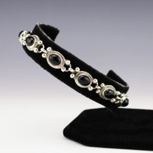 Navajo artists Melvin and Tiffany Jones made this gorgeous bracelet. Sterling silver with Onyx stones. Weighs 110 grams. The entire inner circumference is about 7”, including 1 3/16” opening. (Fits a 7″ wrist). Signed tapers 5/8″ to 1 13/16” wide Artist card included The Navajos began working...