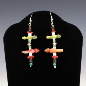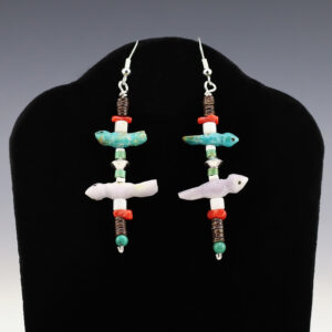 Lovely bird fetish earrings made out of Turquoise, Coral, Olive Shell, Lepidolite, and sterling silver. Hand made by Nancy and Sheldon Westika. These earrings will become a versatile accessory in your jewelry collection. Weighs 6 grams. 13/16″ x 2 1/8″ 2 15/16″ long (including ear wire) Artist card...
