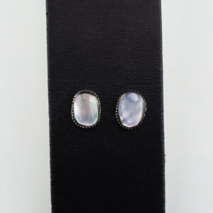 Each earring features Mother of Pearl Shell stones inlaid into a sterling silver setting. Hand made by Zuni jeweler Carina Leekity. These gorgeous earrings will become a versatile accessory in your jewelry collection. 3/8″ x 3/8″ Artist card included Zuni Pueblo is the largest pueblo in New...