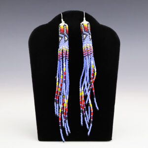 These beautiful beaded earrings will make a statement! Great colors and designs. Hand made by Navajo artist Lorraine Burbank. With ear wires are 5” in length 7/16″ x 4 1/2″ Artist card included When trade beads were introduced to Native Americans, they made these colorful glass beads...