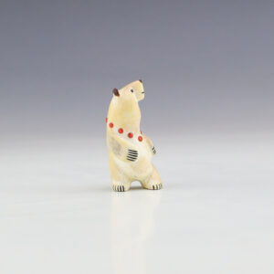 The Bear symbolizes healing and strength. Zuni artist Evalena Boone made this fabulous bear fetish. The carving is made out of Selenite and is bundled with Coral, Pink Mussel, and Turquoise. 1 5/8” tall x 3 7/8” long x 1” wide Artist card included Zuni fetishes are carvings made from...