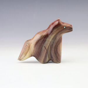 The Horse represents strength, swiftness, and possesses healing powers. Zuni artists Leland Boone and Daphne Quam hand carved this stellar horse fetish. The carving is made out of Nutria Stone with Turquoise eyes. (note-there is natural fracturing in the stone) 1 3/4” tall x 3 3/8” long x 3/4″...