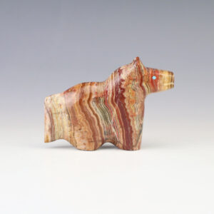 The Horse represents strength, swiftness, and possesses healing powers. Zuni artists Leland Boone and Daphne Quam hand carved this stellar horse fetish. The carving is made out of Onyx with Turquoise eyes. (note-there is natural fracturing in the stone) 1 3/4” tall x 3 9/16” long x 3/4″ wide...