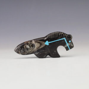The Horse represents strength, swiftness, and possesses healing powers. Zuni artists Leland Boone and Daphne Quam hand carved this wonderful horse fetish. The carving is made out of Onyx with Turquoise eyes. 1 7/8” tall x 2 11/16” long x 11/16″ wide Artist card included Zuni...
