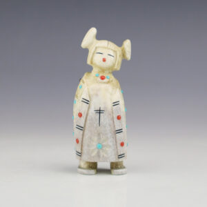 Zuni artist Gabe Sice hand carved this lovely maiden fetish. Made out of antler with intricate detail and inlaid with natural Mediterranean Coral and Penn Shell. This maiden would make a great addition to your Native American or Zuni fetish collection. Signed 2 5/8” tall x 3/4” long x 1/2″...