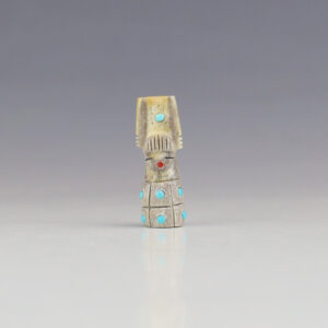 Zuni artist Gabe Sice hand carved this lovely maiden fetish. Made out of antler with intricate detail and inlaid with natural Mediterranean Coral and Penn Shell. This maiden would make a great addition to your Native American or Zuni fetish collection. Signed 1 15/16” tall x 1/2” long x 7/16″...
