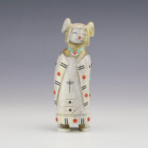Wonderfully carved, this Corn Maiden fetish is made out of Satin Spar Gypsum and is inlaid with Turquoise and Sterling Silver. The Maiden’s hair and corn body is delicately etched, as well as, dragonflies on her dress. Hand made by Zuni artist Todd Westika. The Corn Maiden is an important...
