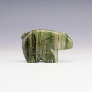 The Bobcat is the knower of secrets, and represents clairvoyance. This marvelous Bobcat is made out of Ricolite with Turquoise eyes. Hand made by Zuni Artist Nelson Yatsattie. Signed 1 5/16” tall x 3 5/8” long x 1” wide Artist card included Zuni fetishes are carvings made from various materials...