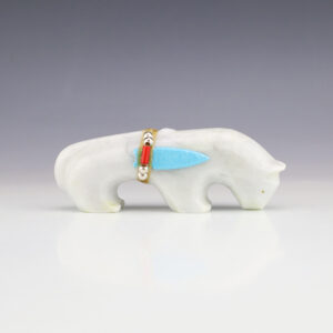 Zuni fetish artists Leland Boone and Daphne Quam carved this outstanding mountain lion out of Utah Marble and bundled it with Mother of Pearl and Turquoise. Zuni mountain lion fetishes represent leadership and resourcefulness. A great addition to your Native American or Zuni fetish collection. 1 15/16″ tall x...