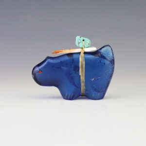 Zuni fetish artists Leland Boone and Daphne Quam hand crafted this wonderful mountain lion out of Glass and bundled it with Mother of Pearl Shell and Turquoise. Zuni mountain lion fetishes represent leadership and resourcefulness. A great addition to your Native American or Zuni fetish collection. 1 1/8″ tall...