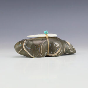 Horned Toad fetishes represent self-reliance and longevity. Zuni fetish carver Nelson Yatsattie created this marvelous horned toad out of Serpentine with Turquoise eyes. He’s ready to scuttle away to a new home. Signed 3/4” tall x 3” long x 1 3/4” wide Artist card included Zuni fetishes are carvings made...