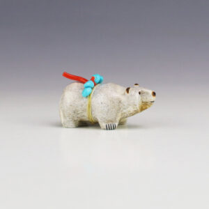 Zuni bear fetishes represent healing and strength. This wonderful bear fetish is made out of a New Mexico Calcite Nodule by Zuni artist Todd Westika. It is adorned with Turquoise, Coral, and silver. This fetish showcases the graceful lines and sculptural quality of Todd’s carvings. A great addition to your...