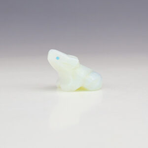 In prehistoric times, frog carvings appeared in jewelry. Zuni frog fetishes are associated with rain, abundance, and fertility. Hand made by Zuni fetish carver Evalena Boone, this wonderful frog fetish is made out of Calcite with Coral eyes. 1 3/8″ tall x 1 5/8” long x 1 1/8” wide Artist...