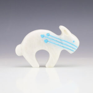 Zuni fetish artist Kenric Laiwakete hand crafted this marvelous Rabbit out of Marble and has an inlaid Turquoise triple heartline. The Rabbit represents virtue, serenity, low curiosity, quiet talent, passion, conquering fear, safety, special guardian of women in childbirth, safe birth, and long life. Signed 2 3/16” tall x...