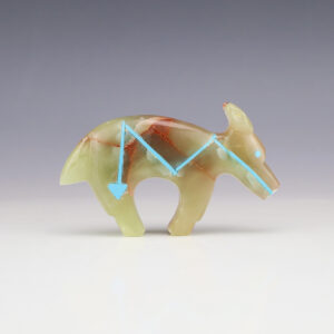 The Horse represents strength, swiftness, and possesses healing powers. Zuni artists Leland Boone and Daphne Quam hand carved this stellar horse fetish. The carving is made out of Onyx with Turquoise eyes. (note-there is natural fracturing in the stone) 1 3/4” tall x 3 9/16” long x 3/4″ wide...