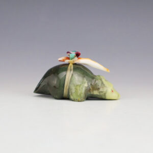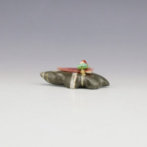 In prehistoric times, frog carvings appeared in jewelry. Zuni frog fetishes are associated with rain, abundance, and fertility. Zuni fetish carver Gabe Sice hand crafted this marvelous frog out of Serpentine and inlaid with natural Coral. Signed 2″ tall x 2 3/4” long x 2 9/16” wide Artist card included...