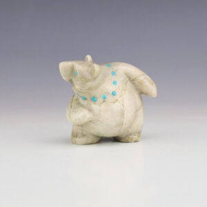 Zuni fetish carver Nelson Yatsattie carved this marvelous mole fetish out Ricolite and it has Turquoise eyes. Zuni mole fetishes amplify the connection with the earth and are the protectors of the crops. The mole is also one of the six directional fetishes and represents the Underground. A great...