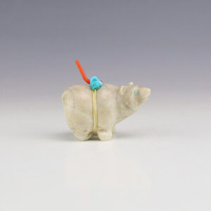 The Bear symbolizes healing and strength. Zuni artist Evalena Boone made this fabulous bear fetish. The carving is made out of Selenite and is bundled with Spiny Oyster, Penn Shell, and Turquoise. 1 1/4” tall x 3 7/8” long x 5/8” wide Artist card included Zuni fetishes are carvings made...