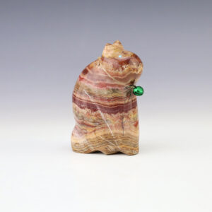 Zuni fetish carver Brandon Phillips made this splendid Bear fetish out Sandstone and has Turquoise eyes. The Bear is the Guardian fetish of the West, and represents healing and strength. A great addition to your Native American or Zuni fetish collection. Signed 1 1/8” tall x 2″ long x 11/16”...