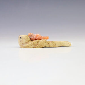 Zuni artist Justin Red Elk carved this fabulous otter out of Fishrock. There is a Alabaster baby on her belly. A great addition to your Native American or Zuni fetish collection. Signed 3/4” tall x 2 7/8” long x 11/16” wide Artist card included Zuni fetishes are...