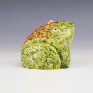 In prehistoric times, frog carvings appeared in jewelry. Zuni frog fetishes are associated with rain, abundance, and fertility. Hand made by Zuni fetish carver Evalena Boone, this stellar frog fetish is made out of Serpentine with Coral eyes and spots. Signed (note-there is natural pitting in the stone) 1/2″ tall...