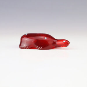In prehistoric times, frog carvings appeared in jewelry. Zuni frog fetishes are associated with rain, abundance, and fertility. Zuni fetish carver Gabe Sice hand crafted this fabulous frog out of Antler and inlaid with natural Mediterranean Coral. Signed 5/8″ tall x 3/4” long x 5/8” wide Artist card included Zuni...
