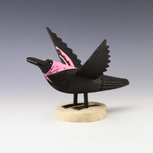 Carved with an amazing degree of detail, this magnificent crow is made out of cottonwood. Navajo artists Orleen and Ray Lansing make a variety of folk art animals. From bears to rabbits, each folk art carving is unique and full of character. Signed 4 1/2” tall x 6 1/2” long...