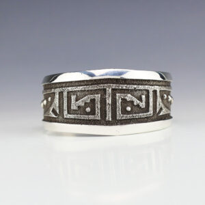 This striking bracelet looks great alone or stacked with other bracelets. Navajo jeweler Randy Secatero made this sterling silver bracelet. Weighs 28 grams. The entire inner circumference is about 7 3/8”, including 1 1/4” opening. Signed. tapers 3/16″ to 3/8” wide Artist card included The Navajos began working with silver...
