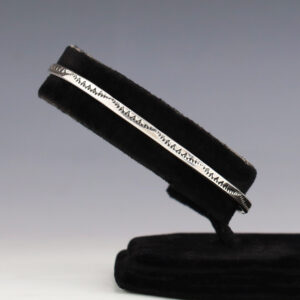 Always in style, these bracelets look fabulous alone or stacked with other bracelets. Navajo jeweler Landon Secatero made this outstanding sterling silver bracelet. Weighs 44 grams. The entire inner circumference is about 6 1/2”, including 1 1/8” opening. (Fits a 6 1/2″ wrist). Signed. tapers 1/4″ to 7/16” wide Artist...