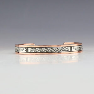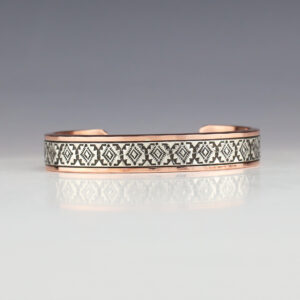 Navajo artist Wylie Secatero made this stellar bracelet. Sterling silver and Copper with a traditional hand stamped design. Weighs 18 grams. The entire inner circumference is about 6 3/4”, including 1 1/16” opening. (Fits a 6 3/4″ wrist). Signed 5/16″ wide Artist card included The Navajos began...