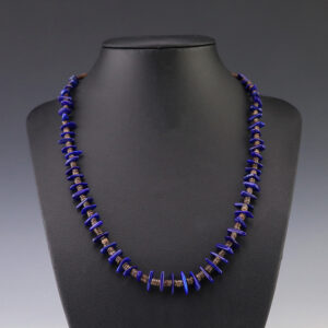 This necklace, hand made by Kewa artist Jeanette Calabaza, is a lovely statement piece. The necklace showcases fine Olive Shell and Lapis. The strand of heishi is finished off with a hook and eye. Weighs 14 grams. 1/8″ wide to 7/16″ wide 18 1/8” long Artist card included...