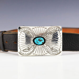 Zuni artists George and Lupe Leekity made this striking buckle. Sterling silver with Turquoise stones. High quality craftsmanship that is a great representation of the traditional Zuni inlay work. Fits a 1 1/2” belt. (Belt not included) Weighs 78 grams. Signed 2 3/16” x 3 1/2″ Artist card included Zuni...