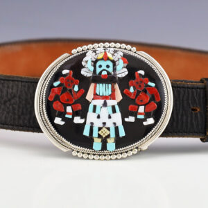 Zuni artist Beverly Etsate made this exquisite belt buckle. Depicted on the buckle, is a Mudhead kachina and a Apache Crown Dancer. Sterling silver with Turquoise, Jet, Coral, and Mother of Pearl Shell inlay. Weighs 48 grams. Signed Fits a 1 1/2” belt. (Belt not included) Signed 2 3/16”...