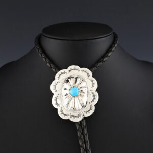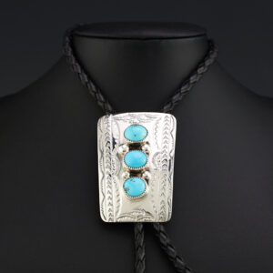 Wonderful sterling silver and Turquoise bolo. Great design! Weighs 36 grams. 1 1/2” wide x 2 3/16″ long 46 1/4″ long with bolo strap & sterling silver tips The Navajos began working with silver in the 19th century, and began making things like buckles, bridles, buttons, rings, canteens,...