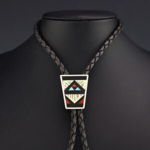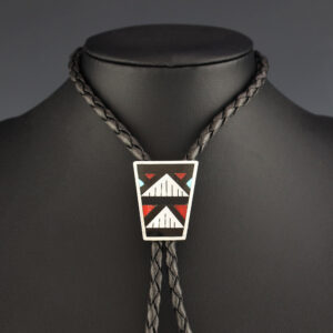 Exquisite rug pattern that features Turquoise, Coral, Jet, and Mother of Pearl Shell inlaid in a sterling silver setting. Great bolo tie that will complement any shirt. Hand made by Diana Othole from the Zuni Pueblo. High quality craftsmanship that is a great representation of the traditional Zuni inlay work. ...