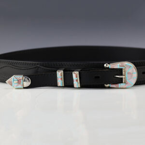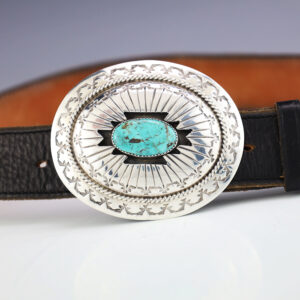 Zuni jewelry makers, Nancy and Sheldon Westika created this exquisite buckle. Made out of sterling silver and inlaid with natural Kingman Turquoise and Mother of Pearl Shell. Zuni artists are known for their lapidary work. The Westikas have been making jewelry since the 1970’s and they are known for their...
