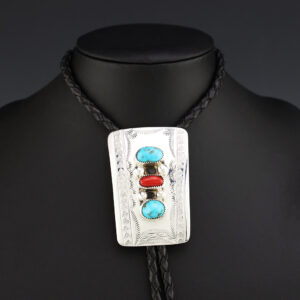 Wonderful sterling silver, Coral, and Turquoise bolo. Great design! Weighs 36 grams. 1 1/2” wide x 2 3/16″ long 46 1/2″ long with bolo strap & sterling silver tips The Navajos began working with silver in the 19th century, and began making things like buckles, bridles, buttons, rings,...