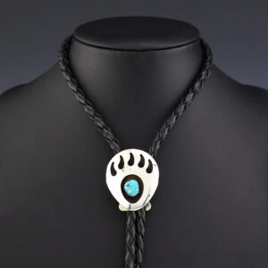 Zuni artist Ernie Ohmsatte made this marvelous Bear bolo tie. Sterling silver with Turquoise, Jet, Lapis, Pink Mussel, Malachite, Laboratory Opal, Apple Coral, and Mother of Pearl Shell inlay. This handsome bolo tie will look great on any shirt. Weighs 40 grams. Signed. 1 1/2″ x 2 5/16” 47 1/2″...