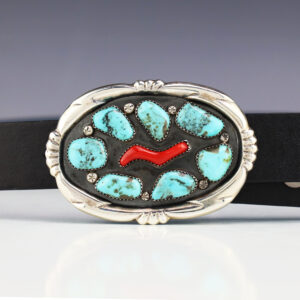 Zuni artist Wilbur Iule made this amazing buckle. Sterling silver with Coral and Turquoise stones. Fits a 1 1/4” belt. (Belt not included) Weighs 44 grams. Signed 3” long x 2” wide Artist card included Zuni Pueblo is the largest pueblo in New Mexico, and because of...