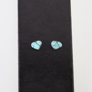 These beautiful heart earrings were hand made by Zuni artist Lynette Laate. Sterling silver and Turquoise. Weighs 6 grams. These gorgeous earrings will become a versatile accessory in your jewelry collection. Signed. 13/16″ wide x 1 5/16″ long Artist card included Zuni Pueblo is the largest pueblo...
