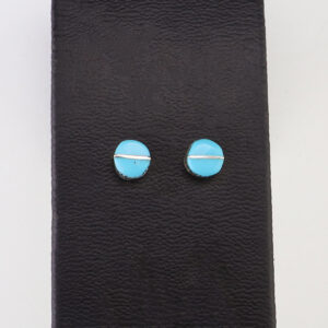 Each earring features Turquoise inlaid into a sterling silver setting. Hand made by Zuni artist Rowena Laweka. These lovely earrings will become a versatile accessory in your jewelry collection. 1/4 x 1/4″ Artist card included Zuni Pueblo is the largest pueblo in New Mexico, and because of...
