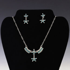 Zuni artist Darryl Fambrough made this beautiful necklace and earring set. Sterling silver and set with Turquoise An exquisite statement piece that you will enjoy for many years. The necklace weighs 8 grams. The earrings weighs 4 grams. Signed 5/8″ wide x 1 1/8″ long-earrings 5/8″ wide x 17 ...
