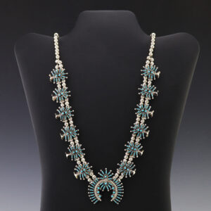 Gorgeous sterling silver and turquoise needlepoint squash blossom necklace by Zuni artist Lorna Mahkee. The squash blossoms and the naja are set with Turquoise stones. The necklace is strung with sterling silver 4 mm beads. The necklace is finished off with a sterling silver hook and eye. A timeless beauty...