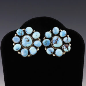 Beautiful cluster earrings hand made out of sterling silver and Golden Hills Turquoise by Navajo artist Jones Delgarito. These fabulous earrings will become a versatile accessory in your jewelry collection. Weighs 20 grams. Signed 1 5/16″ wide x 1 7/16″ long Artist card included The...