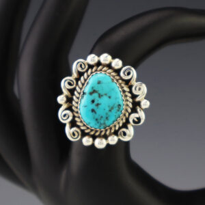 This ring is a great representation of hand made Navajo jewelry and will make a statement on your hand. Turquoise is set into a sterling silver setting. Made by Navajo artist Priscilla Smith. Weighs 6 grams. Size 8 3/4. 7/8″ long Artist card included The Navajos began...