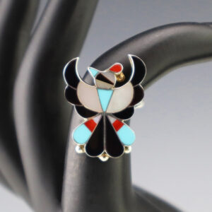 Zuni artist Breon Wallace made this fabulous Thunderbird ring. Zuni artists are known for their fine lapidary skills. Each stone is hand cut, polished, and set into a sterling silver setting. The ring is inlaid with Turquoise, Mother of Pearl Shell, Coral, and Jet. Weighs 4 grams. Size 5 1/4. ...