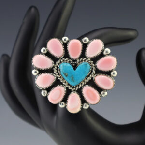 Zuni artist Carlo Lonjose made this beautiful cluster heart ring. Sterling silver and set with natural Pink Conch and Kingman Turquoise stones. Carlo comes from a family of Zuni jewelers. Weighs 20 grams. Size is adjustable. Signed. 1 3/4” x 1 9/16″ Artist card included Zuni Pueblo...