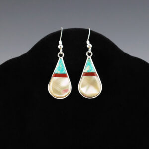 Zuni jewelry artist Delberta Boone hand made these lovely earrings. Made out of sterling silver and inlaid with Turquoise, Coral, Jet, and Mother of Pearl Shell. Weighs 4 grams. Signed 1/2” x 1 3/4″ Artist card included Zuni Pueblo is the largest pueblo in New Mexico, and...