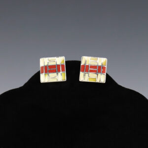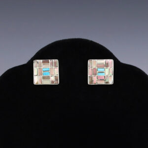 Each earring features Mother of Pearl Shell stones inlaid into a sterling silver setting. Hand made by Zuni jeweler Carina Leekity. These gorgeous earrings will become a versatile accessory in your jewelry collection. 3/8″ x 3/8″ Artist card included Zuni Pueblo is the largest pueblo in New Mexico, and because...