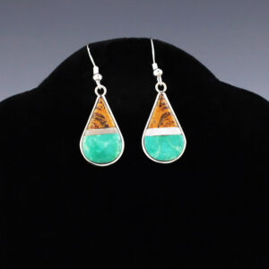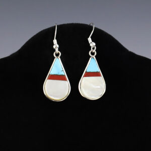 Zuni artist, Shawn Sheyka created these amazing earrings. Made out of sterling silver and inlaid with Turquoise, Laboratory Opal, and Coral stones. Zuni artists are known for their lapidary work. Weighs 6 gram. Signed 1/2″ wide x 2 1/8” tall Artist card included Zuni Pueblo is the largest pueblo in...